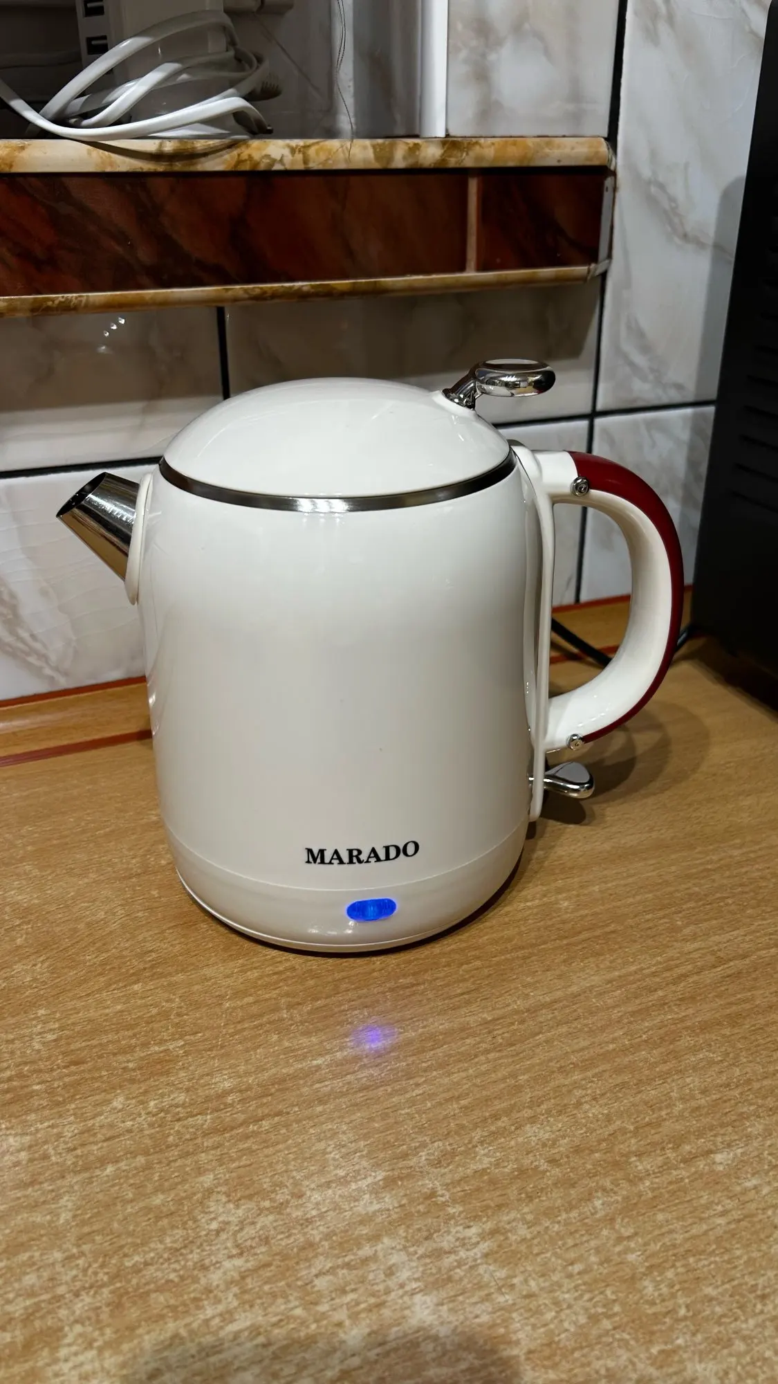 A very beautiful kettle, compact, boils quickly. It has a blue indicator light that glows during operation. The handle is a bit flimsy and squeaks. I hope it won't fall off. The interior is stainless steel, while the body and handle are plastic.